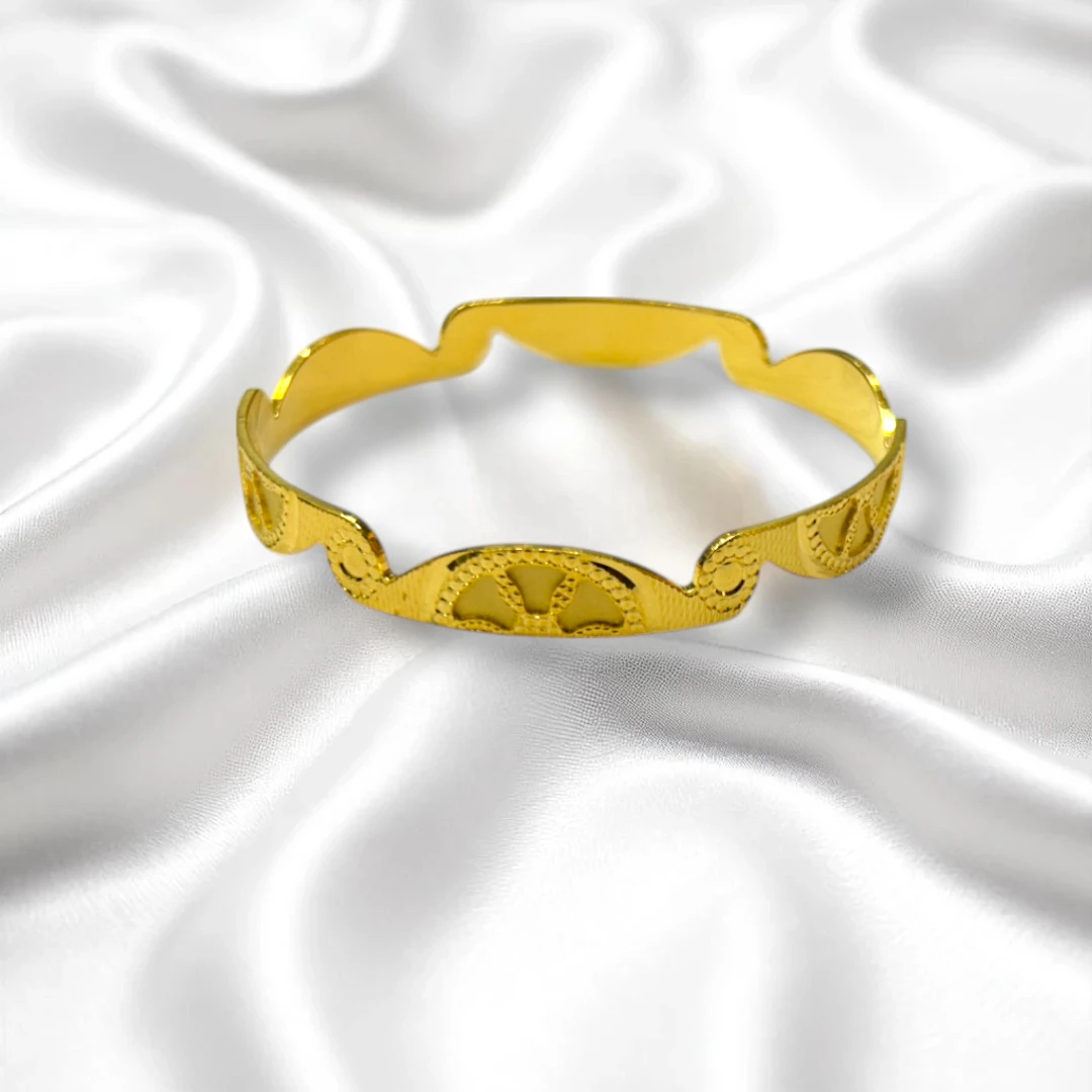 Inspired by traditional hand fans, this unique carving creates rhythm and dimension in gold.